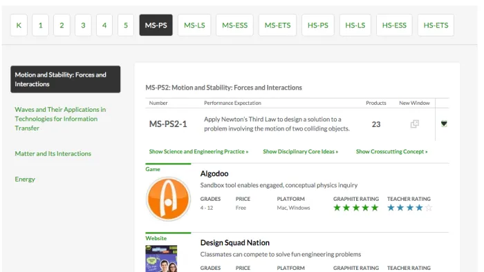 Our NGSS Explorer highlights hundreds of apps, games, and websites evaluated by our expert reviewers and tagged for relevant performance expectations (PEs). Finding the right tool for your NGSS-aligned lessons is as easy as selecting a grade, topic, and PE, which generates a list of suggested tools ready for classroom integration. We have also included the three NGSS dimensions -- science and engineering practices (SEP), disciplinary core ideas (DCI), and crosscutting concepts (CC) -- for quick and easy reference.