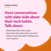 3 resourcesOur digital experiences are so connected with our everyday life that they are part of our overall wellness. Good news: You don't have to be a tech expert to help your child master digital well-being. Digital well-being is experiencing media and technology in ways that support one's mental, physical, social, and emotional health. From balanced screen time to safe online interactions, talk about how tech can help or hinder your personal and family values. You might wish for your child's top personal values to match yours, but there's no right or wrong here. Just a great opportunity to connect as a family, without holding any judgments.