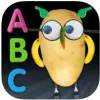 Kids choose a letter from the alphabet, shown at the bottom of the screen, and then see and hear the letter on-screen. They tap the letter again to make an object that begins with that letter appear, like a robot for R. Then -- "Uh-oh!" -- the object breaks apart into pieces that are actually everyday objects, like buttons or fruit, and kids have to reassemble the picture.
